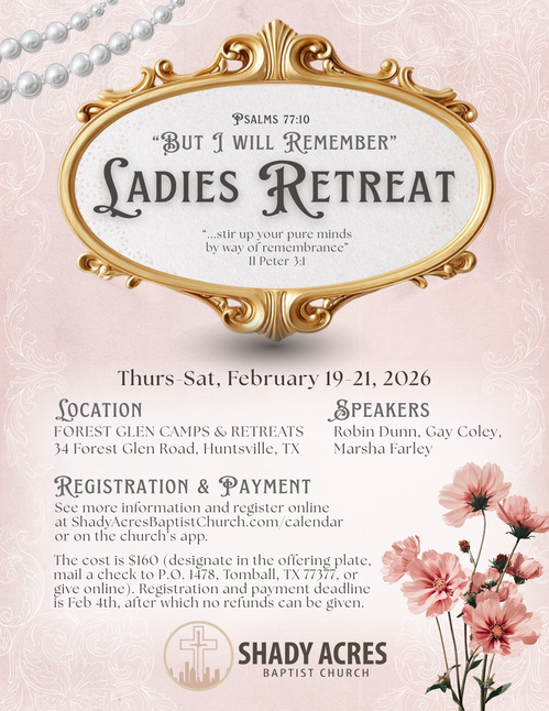 Come to our ladies retreat at the Forest Glen Camp in Huntsville, TX for a spiritual time of rejuvenation, fun and fellowship!